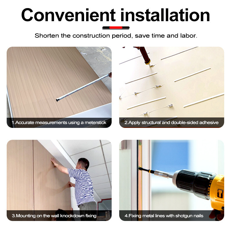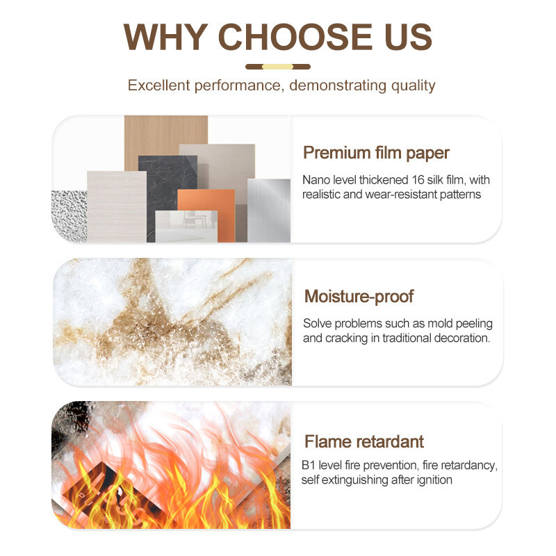 Eenvoudige installatie, Milieubescherming, Flexibel, Buigbaar, Hoge dichtheid, opvouwbaar. Vuurvast + waterdicht + Vochtbestendig + krasbestendig + Geluidsabsorberend, Schimmelbestendig. Lichtgewicht. Duidelijke texturen, Verscheidenheid aan kleuren, etc.